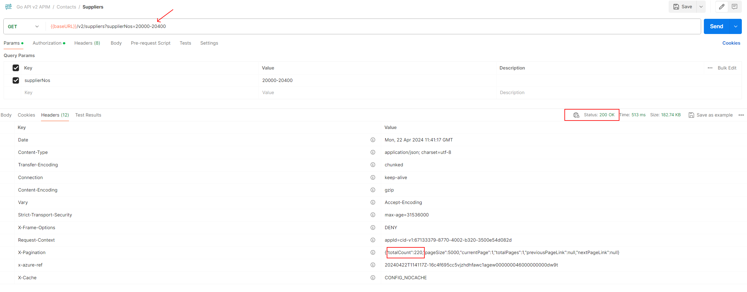 A: If the request URL is more than 2000 characters you will automatically get an 404 Not Found error from the API. This could be an issue if you are trying to filter on multiple values. For example if you filter on all supplier numbers between 20000 and 20400, the overall request URL will consist of 2469 characters: